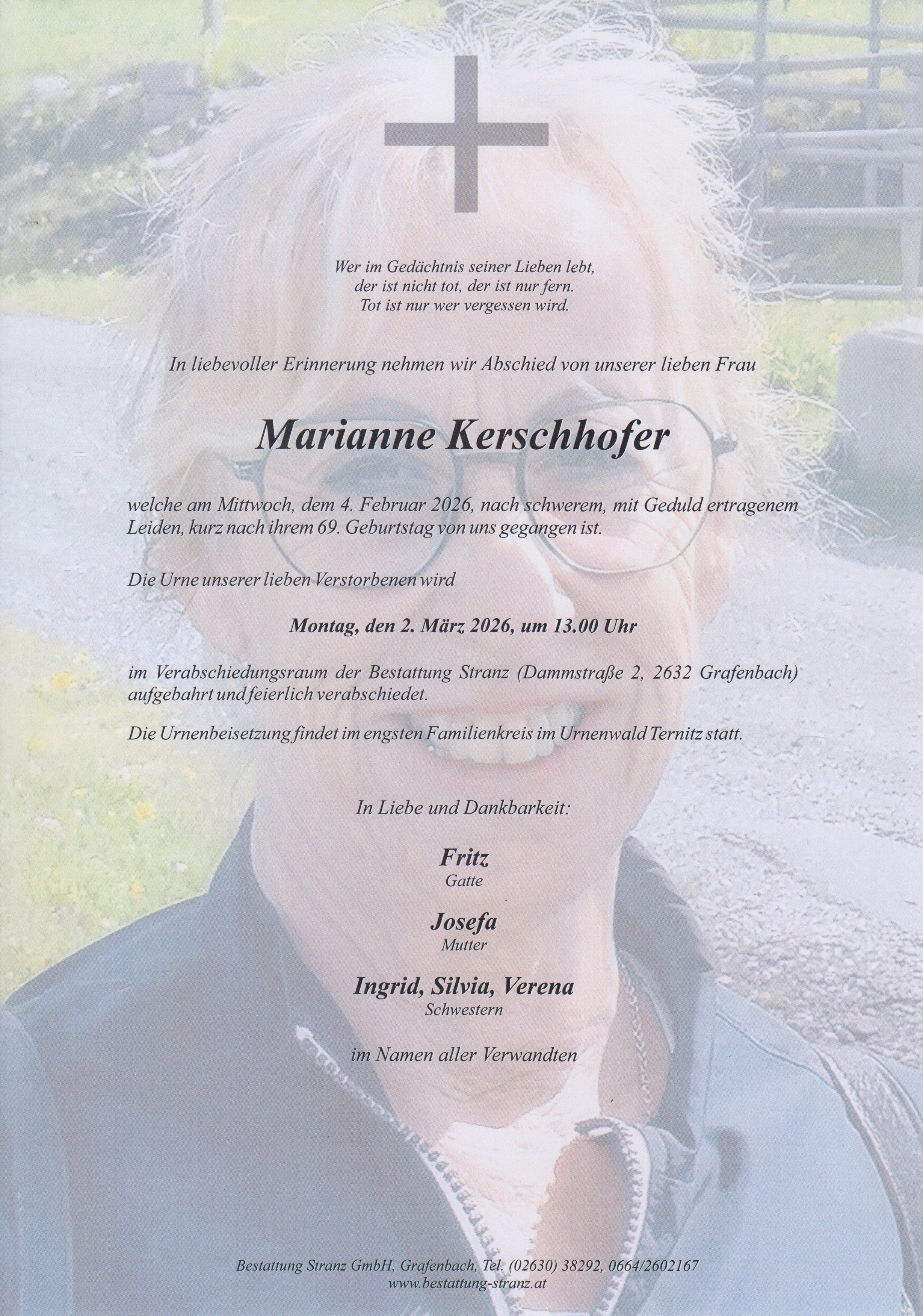 Verabschiedung am Montag, dem 2. März, um 13.00 Uhr Verabschiedungsraum Bestattung Stranz Beisetzung im engsten Familienkreis